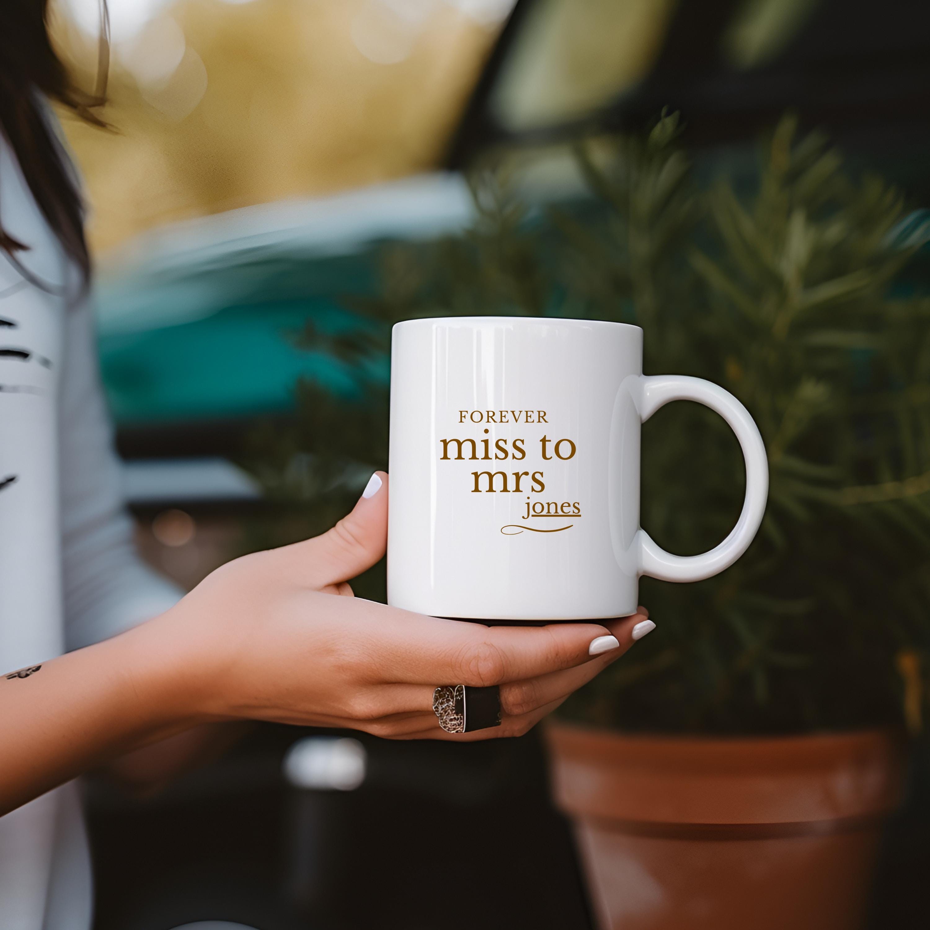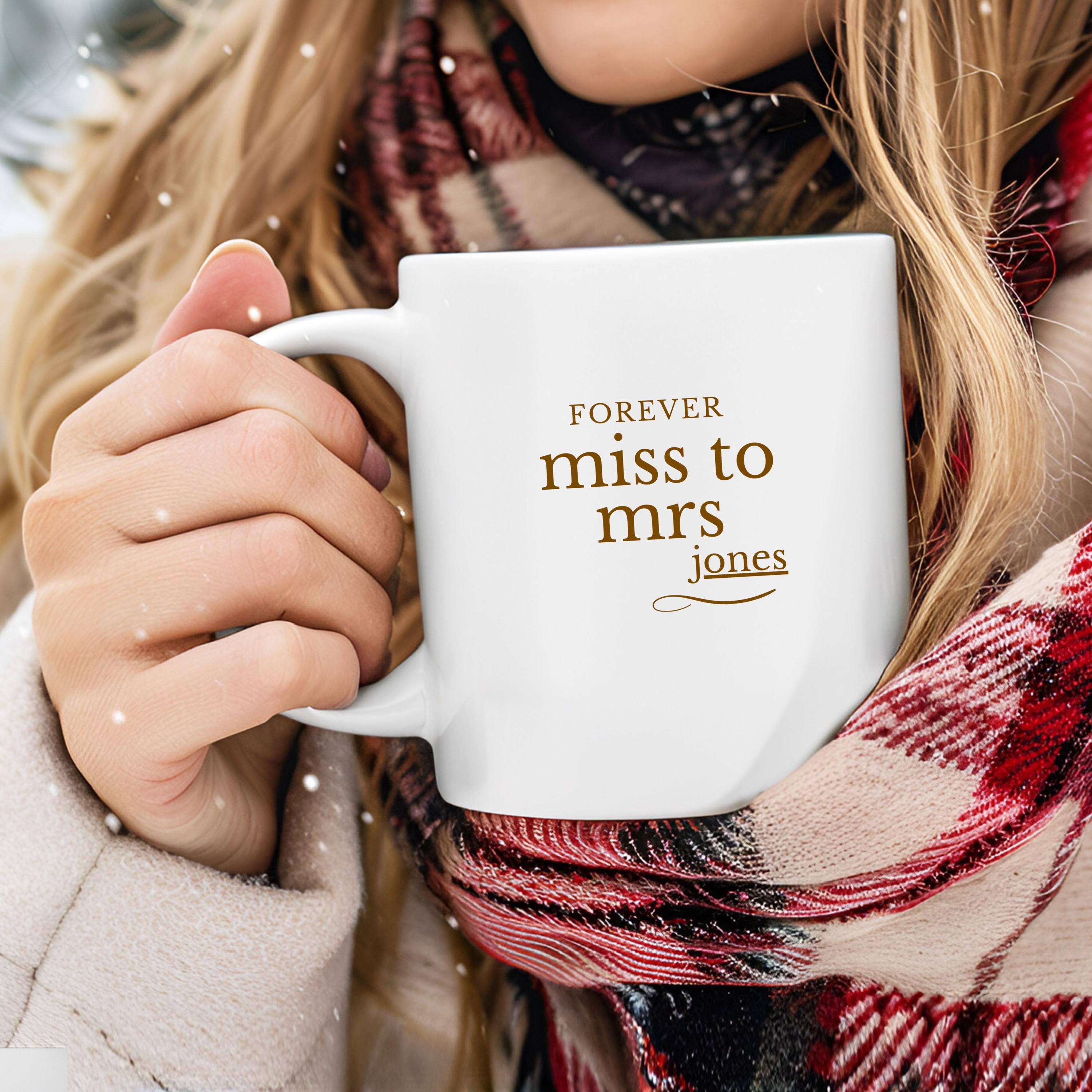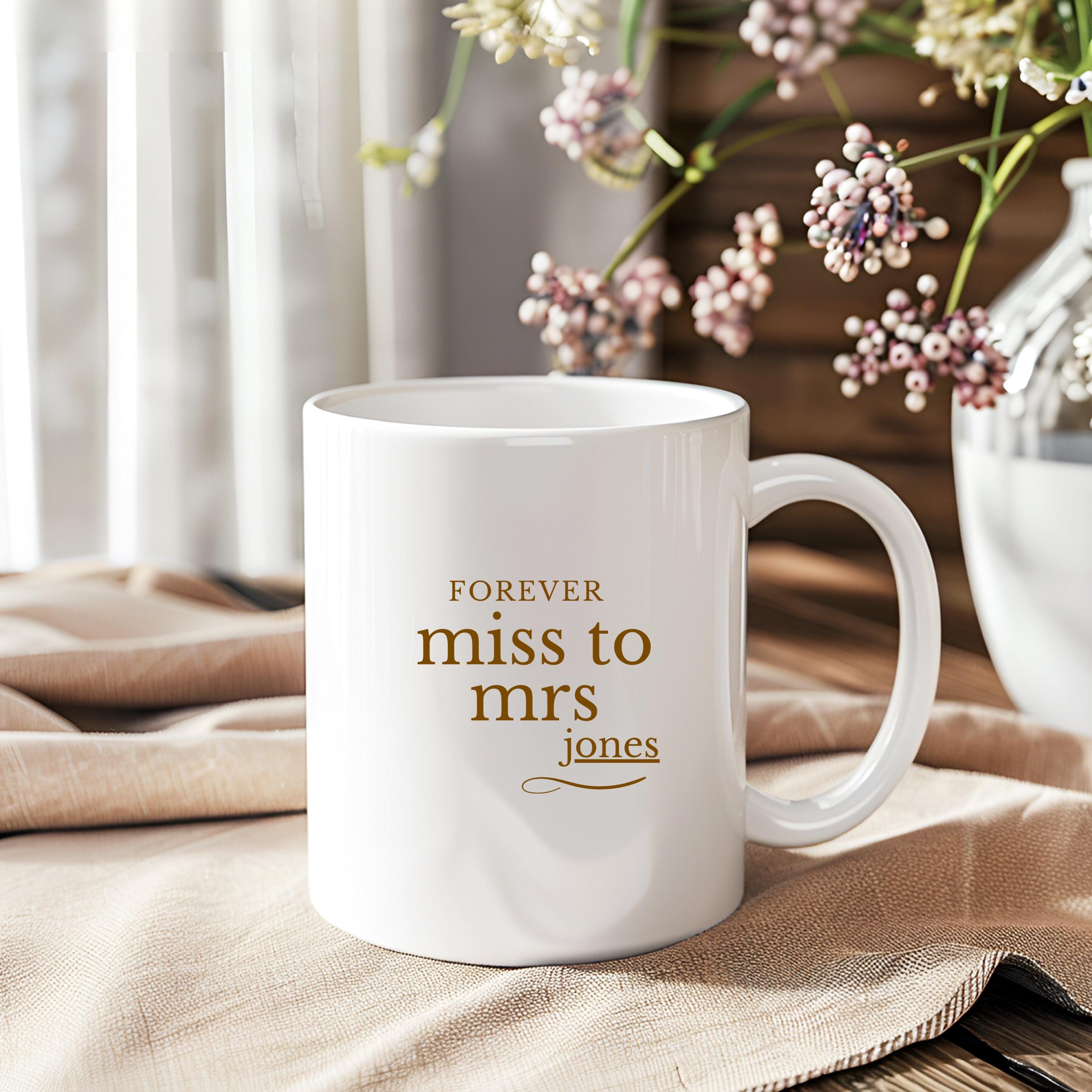 This “Miss to Mrs” mug is the perfect gift for any bride-to-be. Customize it with her future last name to create a meaningful keepsake she'll love using every day. Ideal for engagements, bridal showers, or wedding gifts.
